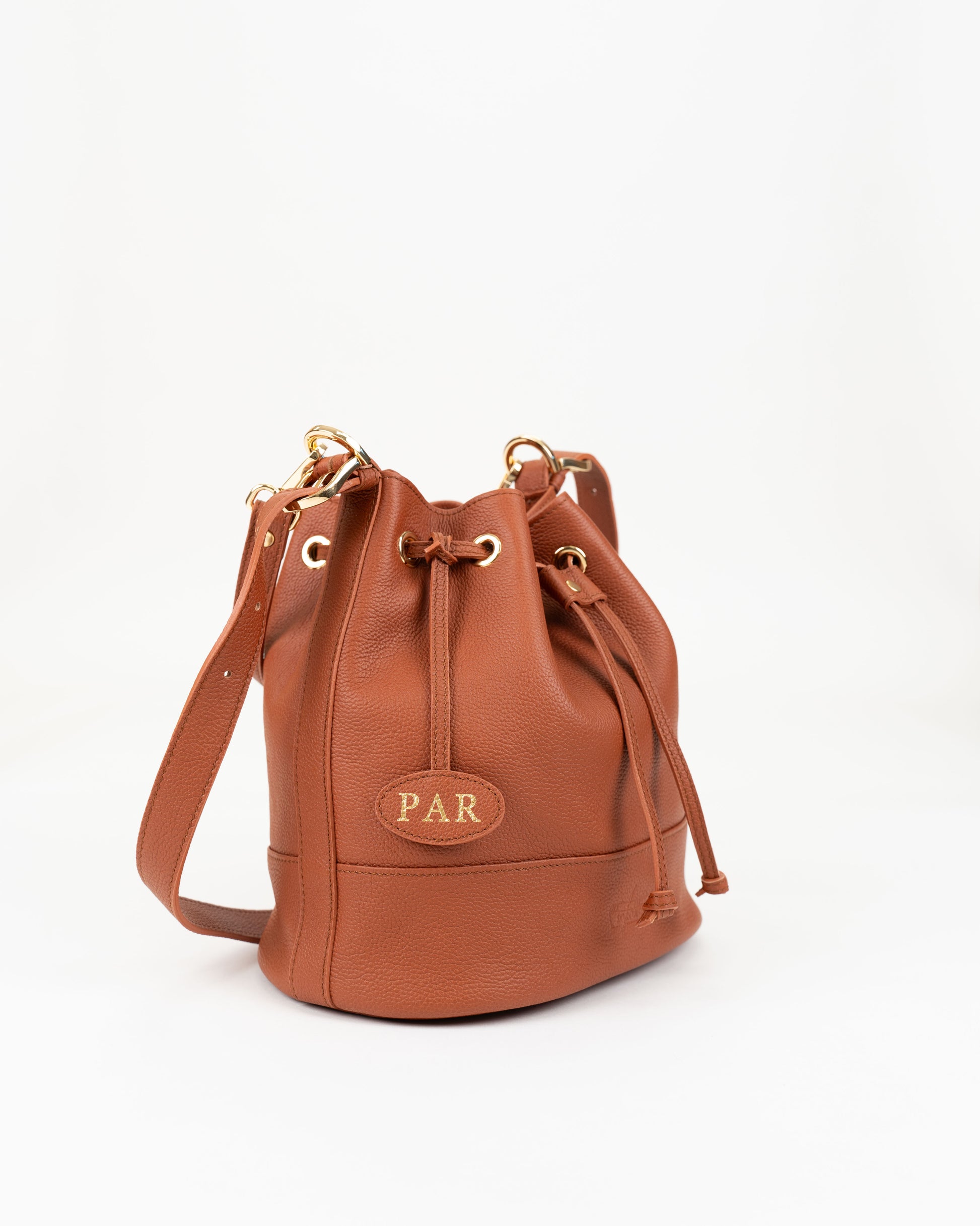 Description: High-quality, very resistant leather sack bag with strap closure.